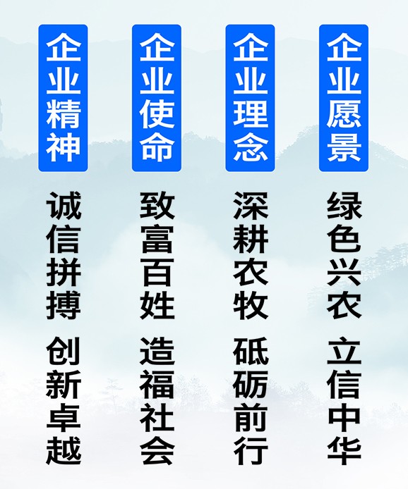 绿色兴农,立信中华:绿色代表健康、自然、安全、环保,兴农就是把实现农业更强,农民更富,农村更美作为企业的责任,以诚信屹立于中华大地,打造全国一流的民营企业。
